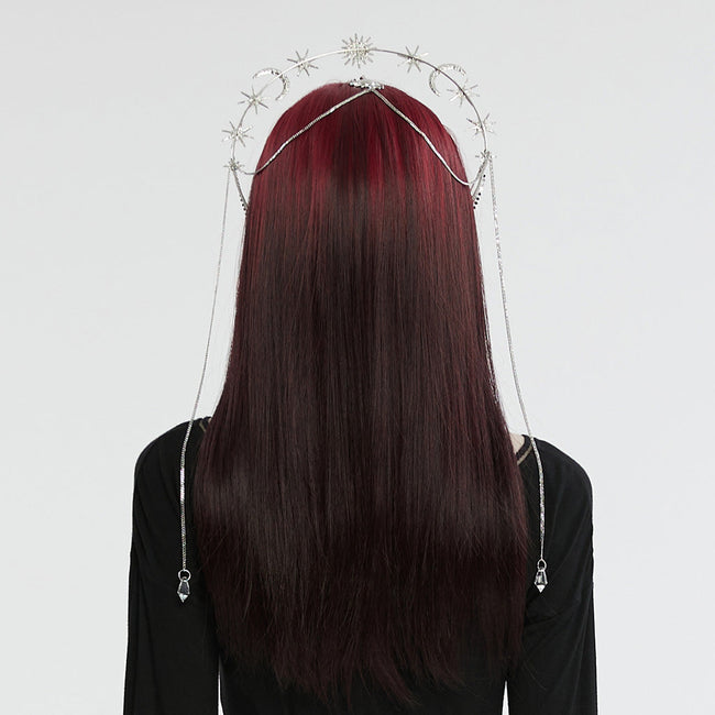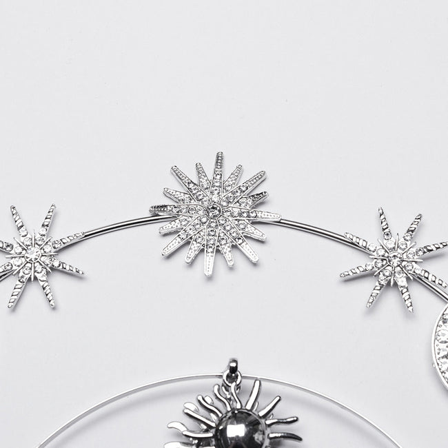 2. Composed of multiple stars and moon of different sizes and inlaid with diamonds, the circular chains on both sides hang gracefully, and the water droplet pendant in the forehead is shining joyfully.